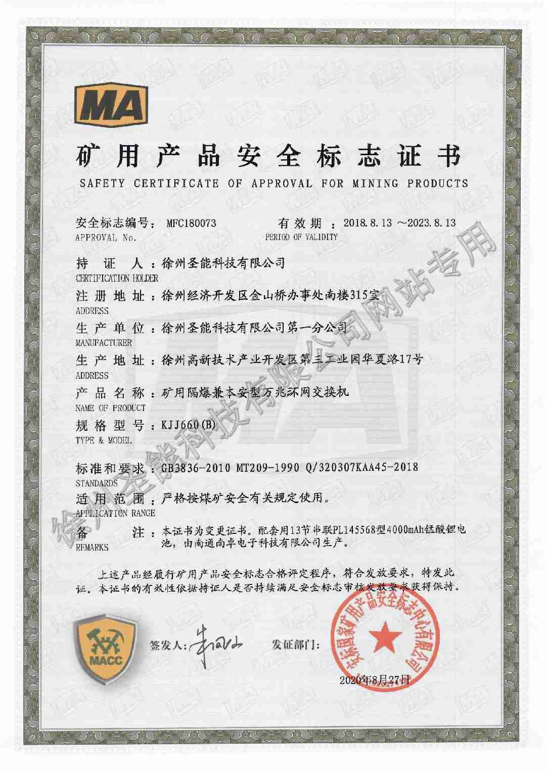 KJJ660(A)矿用隔爆兼本安型交换机防爆证