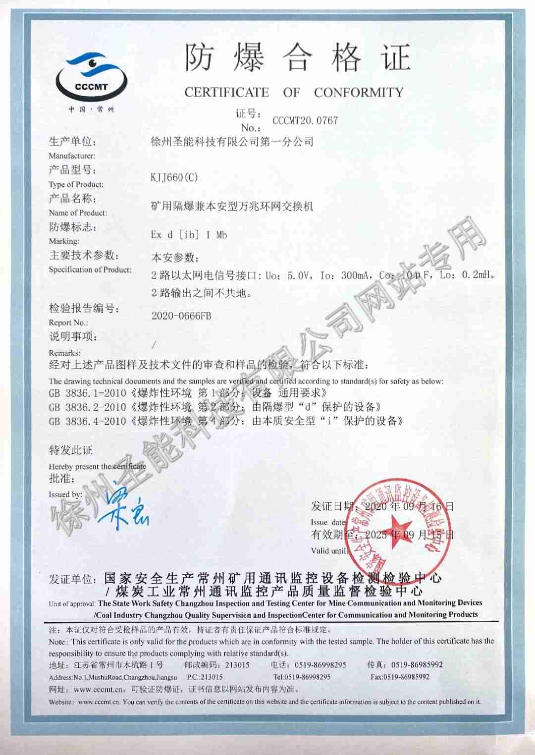 KJJ660(C)矿用隔爆兼本安型万兆环网交换机防爆证