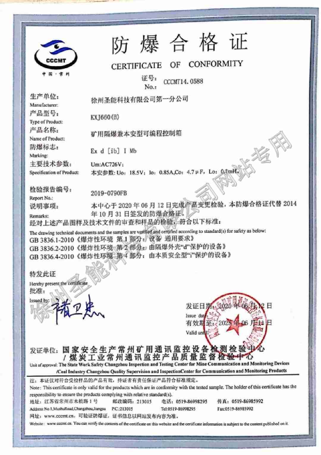 KXJ660(B)矿用隔爆兼本安型可编程控制箱防爆证