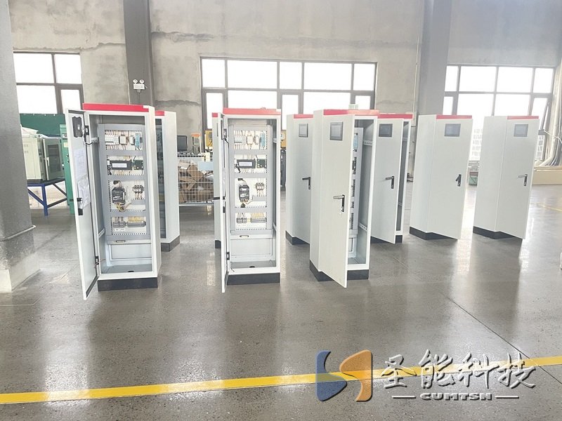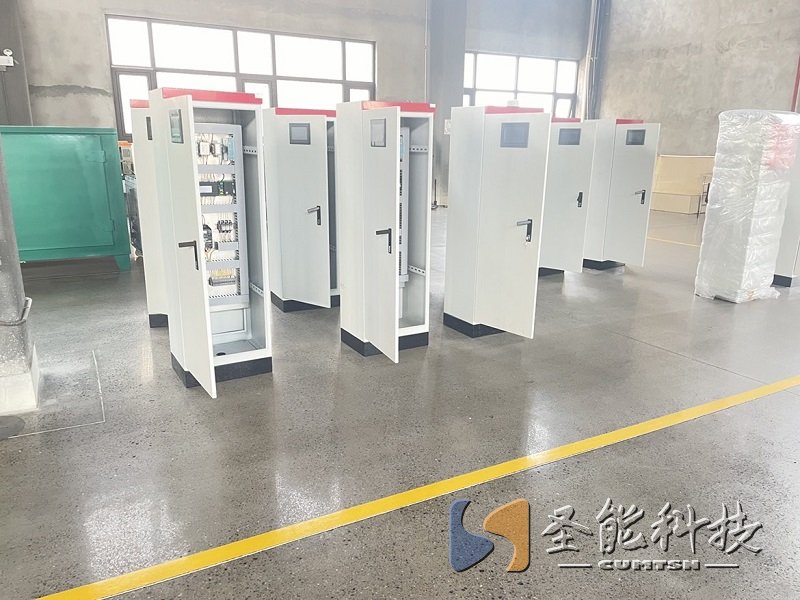 称重给料机的制造组装工作,目前正在对给料机控制柜进行最终的检验测试工作。一排排一列列给料机控制柜整齐排列,可见圣能科技