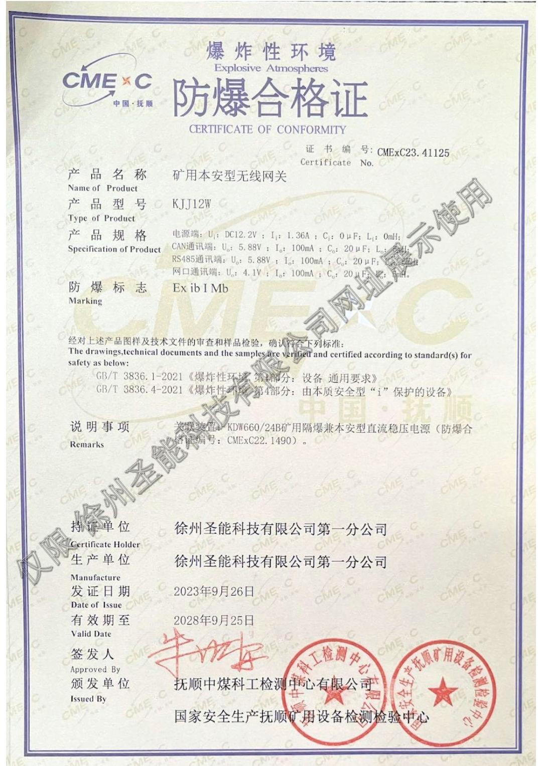 KJJ12W矿用本安型无线网关安标证